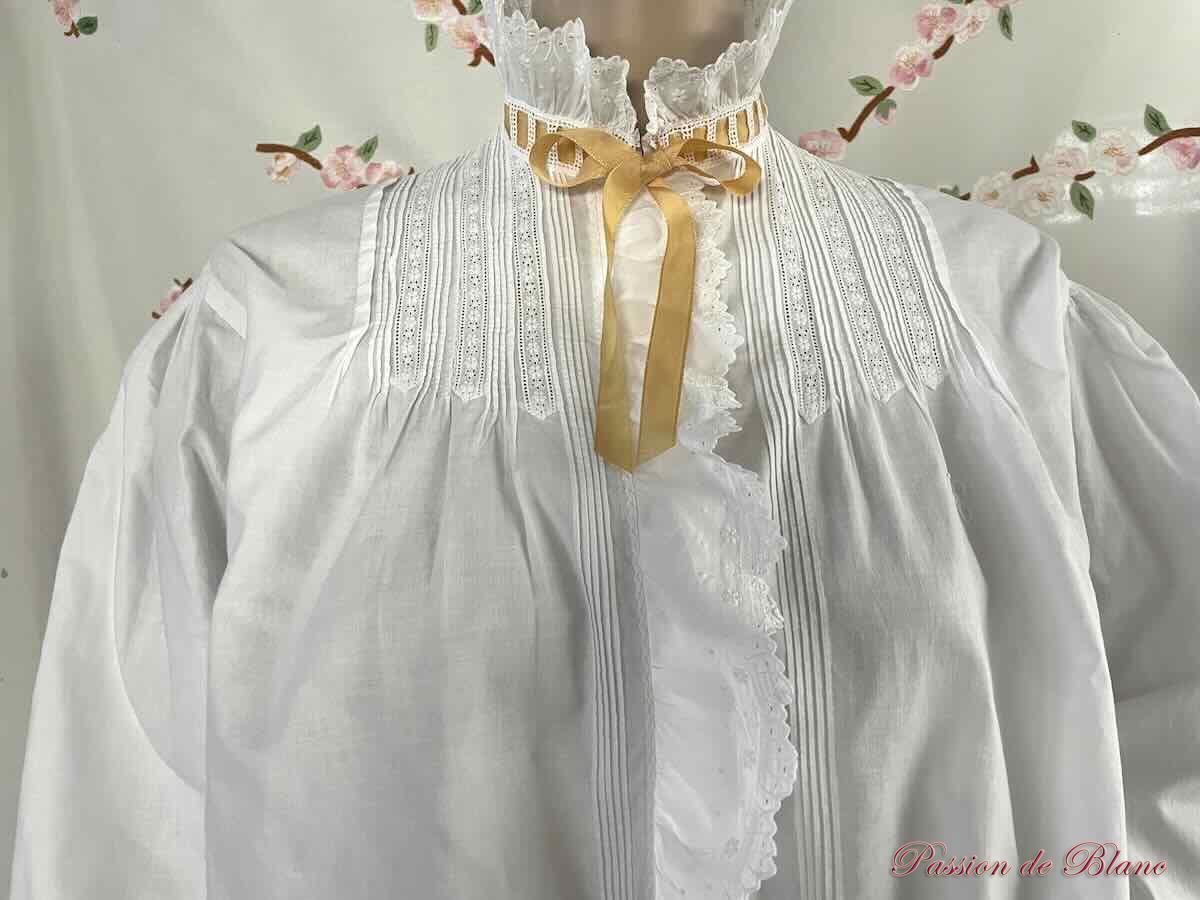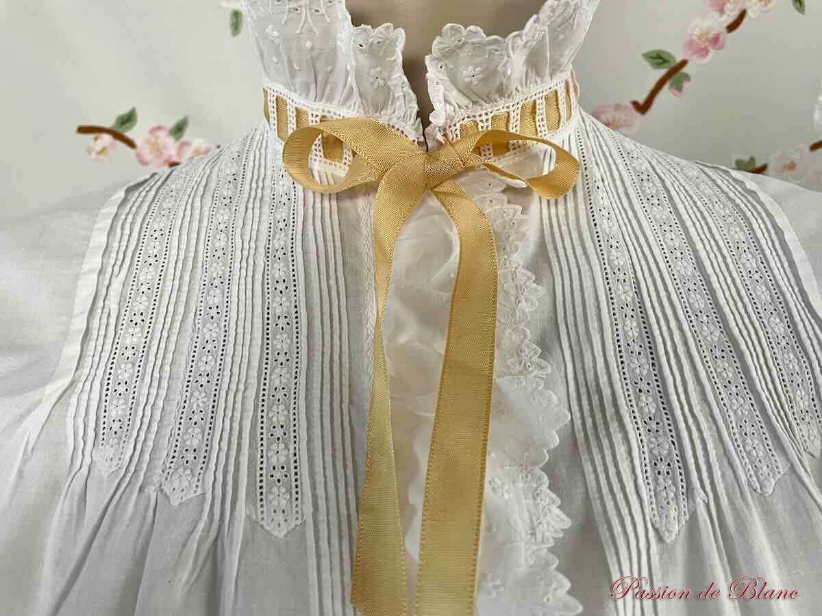 Le devant est agrémenté d’une multitude de plis nervurés, de fins entre-deux brodés de fleurettes.