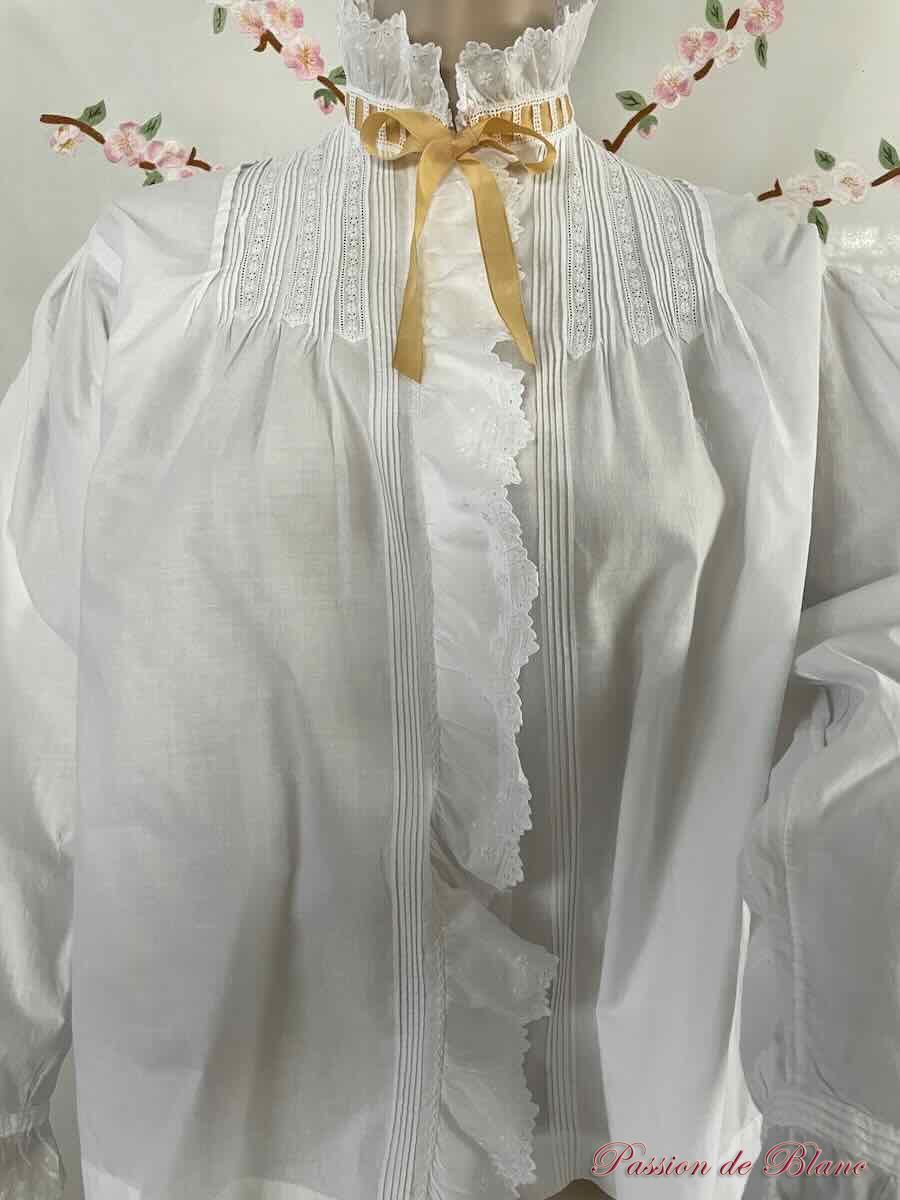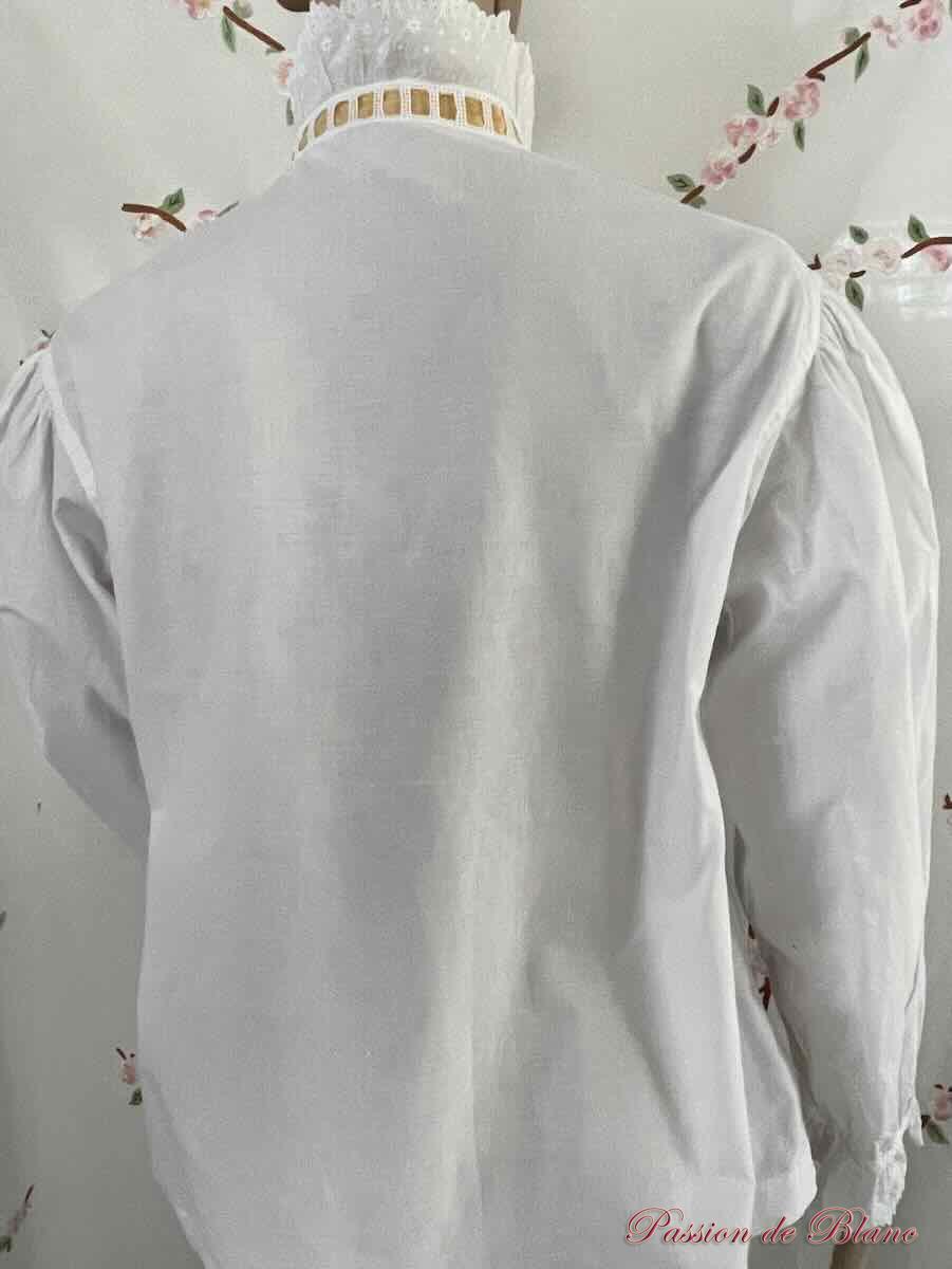 Un joli volant froncé enjolive le bas des manches, le devant de la chemise et le haut du col.