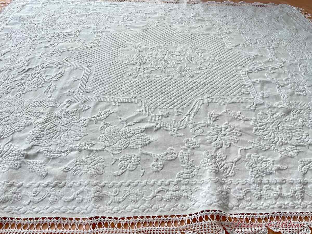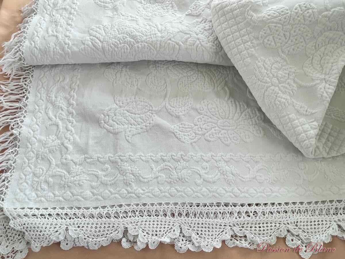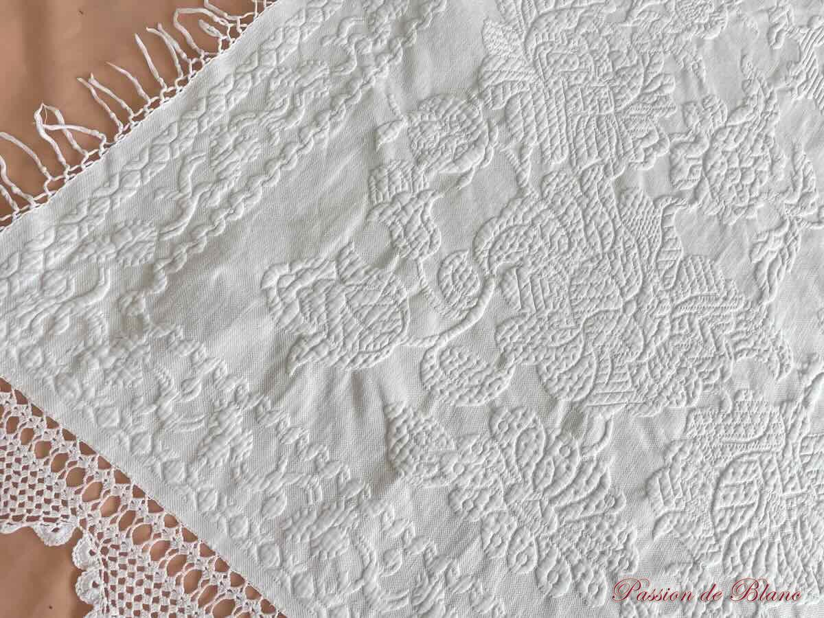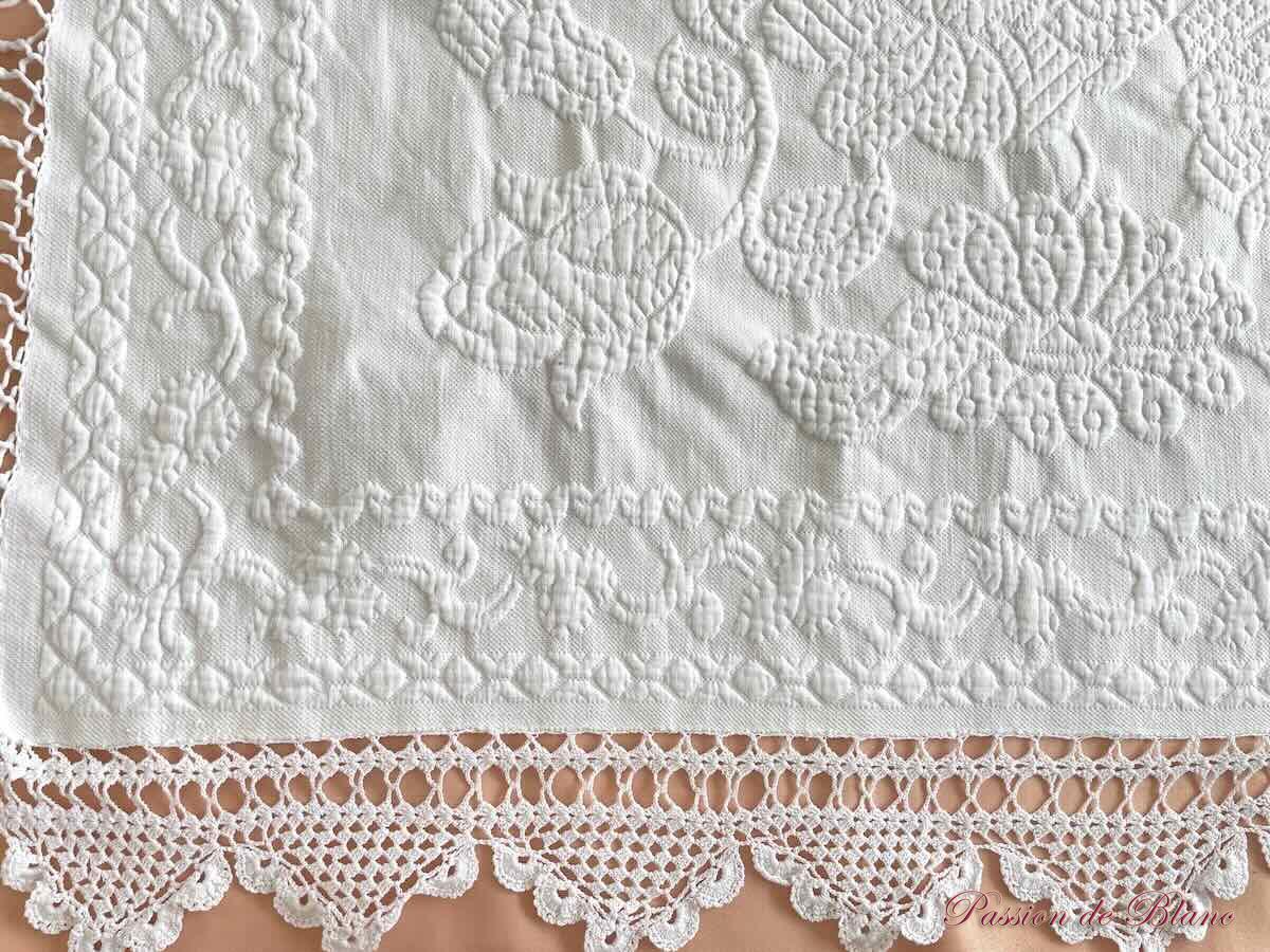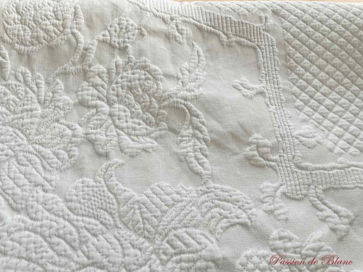 Très belle Coutepointe en piqué blanc avec imposant relief : motifs floraux