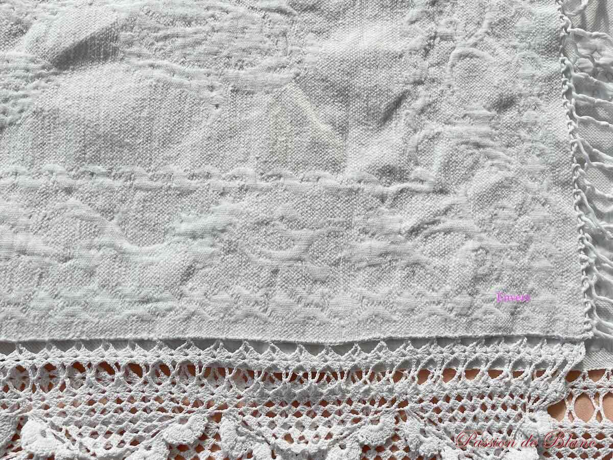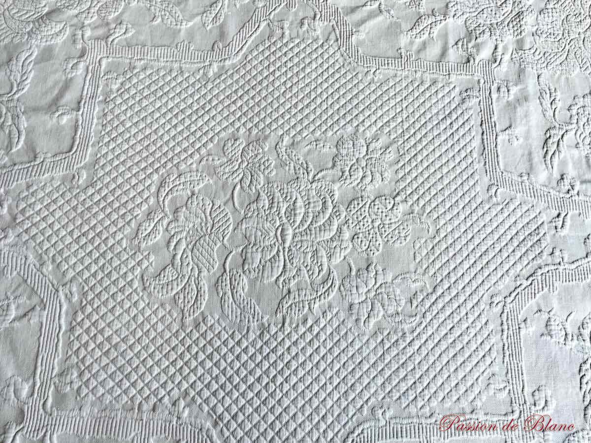 Pièce en piqué Marseillais avec un imposant relief sur l’endroit laissant voir de très beaux motifs. L’envers est tissé serré. Très belle qualité et tenue.