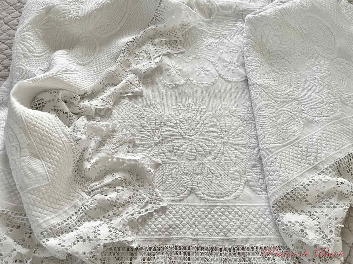 Superbe couverture en piqué Marseillais blanc avec relief motifs floraux