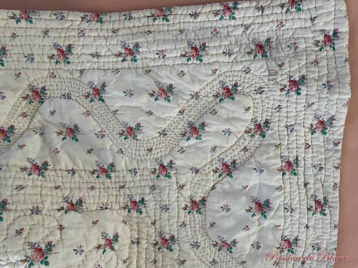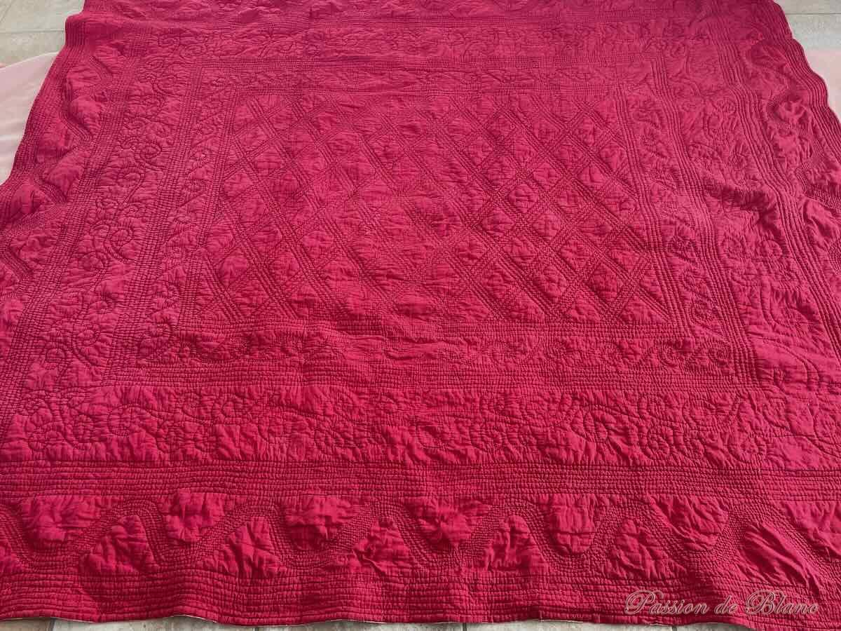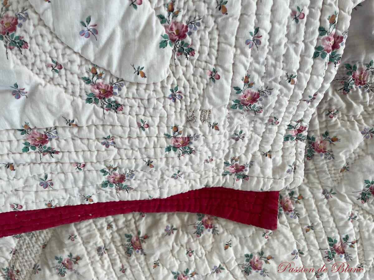 Couverture piquée deux faces: côté rouge grenat,l’autre imprimé de fleurettes