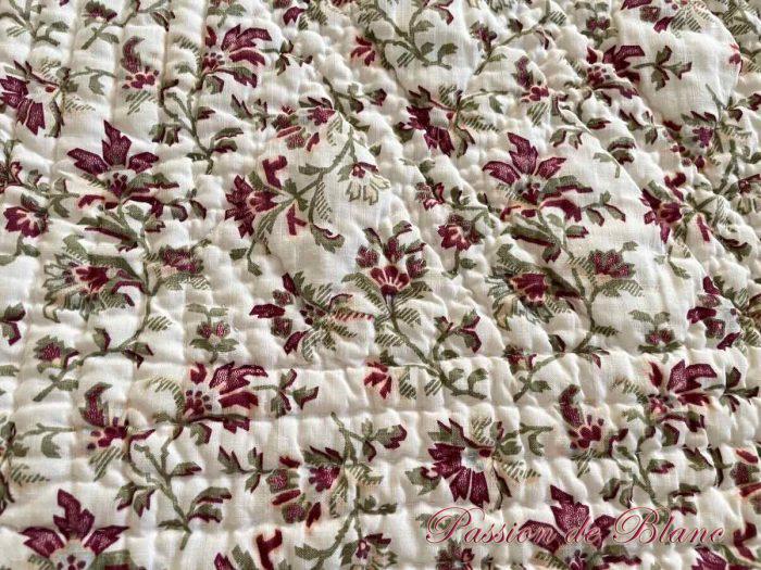 Courtepointe en pur coton réalisée sur les deux faces dans des cotonnades imprimées : l’une typiquement provençale, l’autre fond blanc avec fin branchages fleuris.