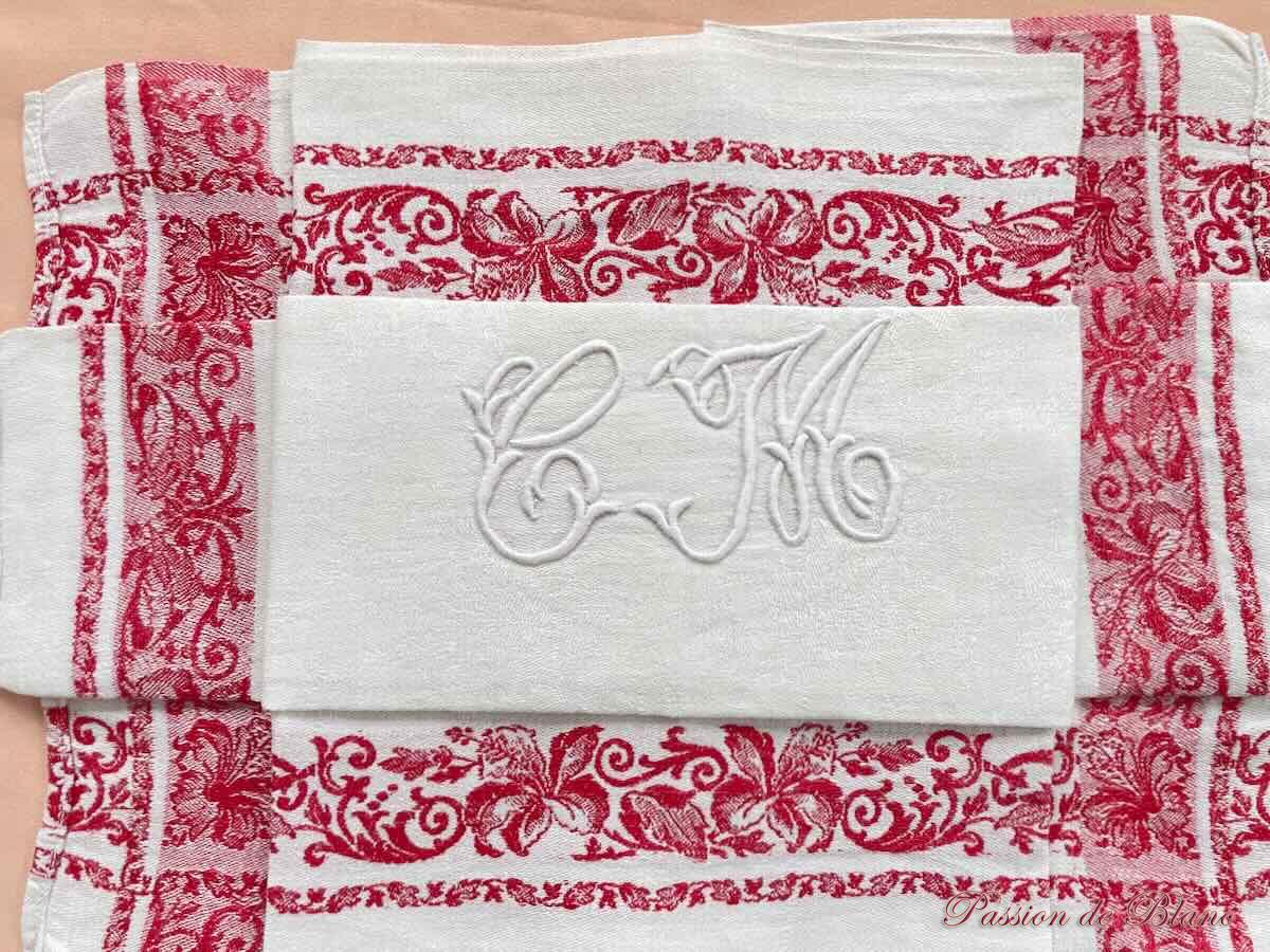 Deux grandes serviettes table, liteaux rouges Napoléon III pur lin