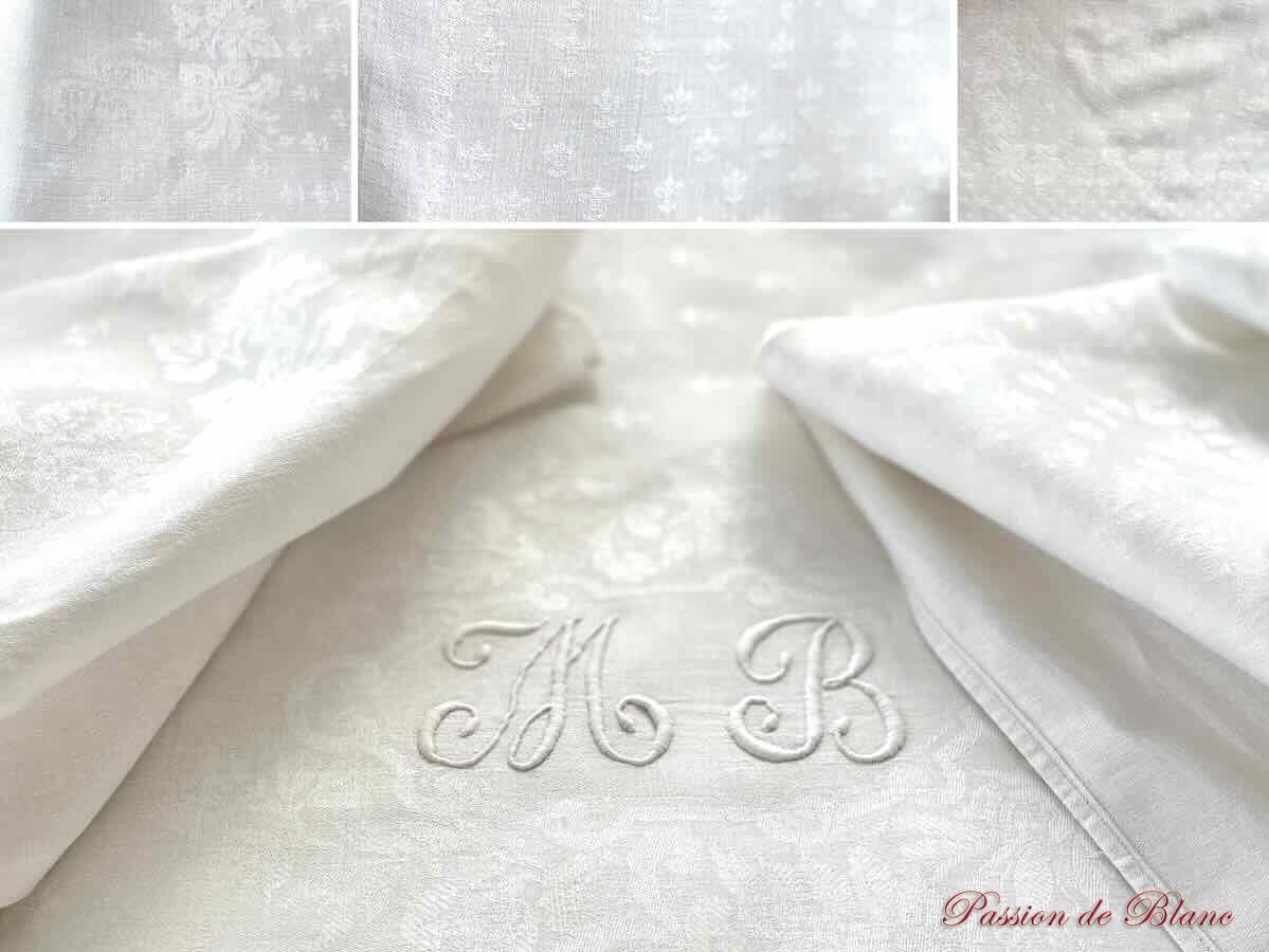 Lot 12 serviettes table en damassé de lin, motifs iris, monogramme TR