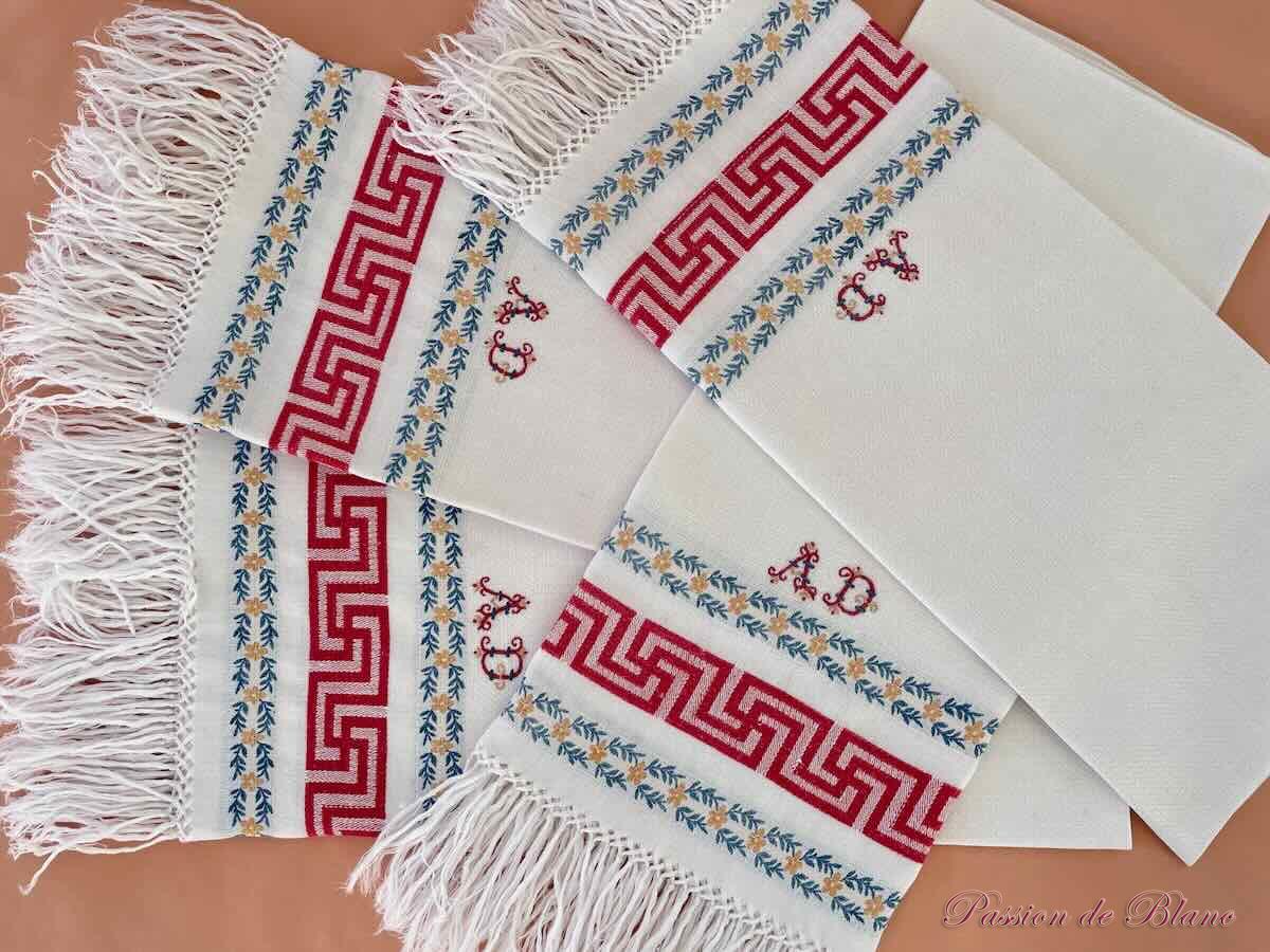 Merveilleuses serviettes d’invités sur une belle toile de lin fin ornée de magnifiques liteaux avec guirlandes fleuries et frises géométriques en couleur : rouge, safran et bleu.