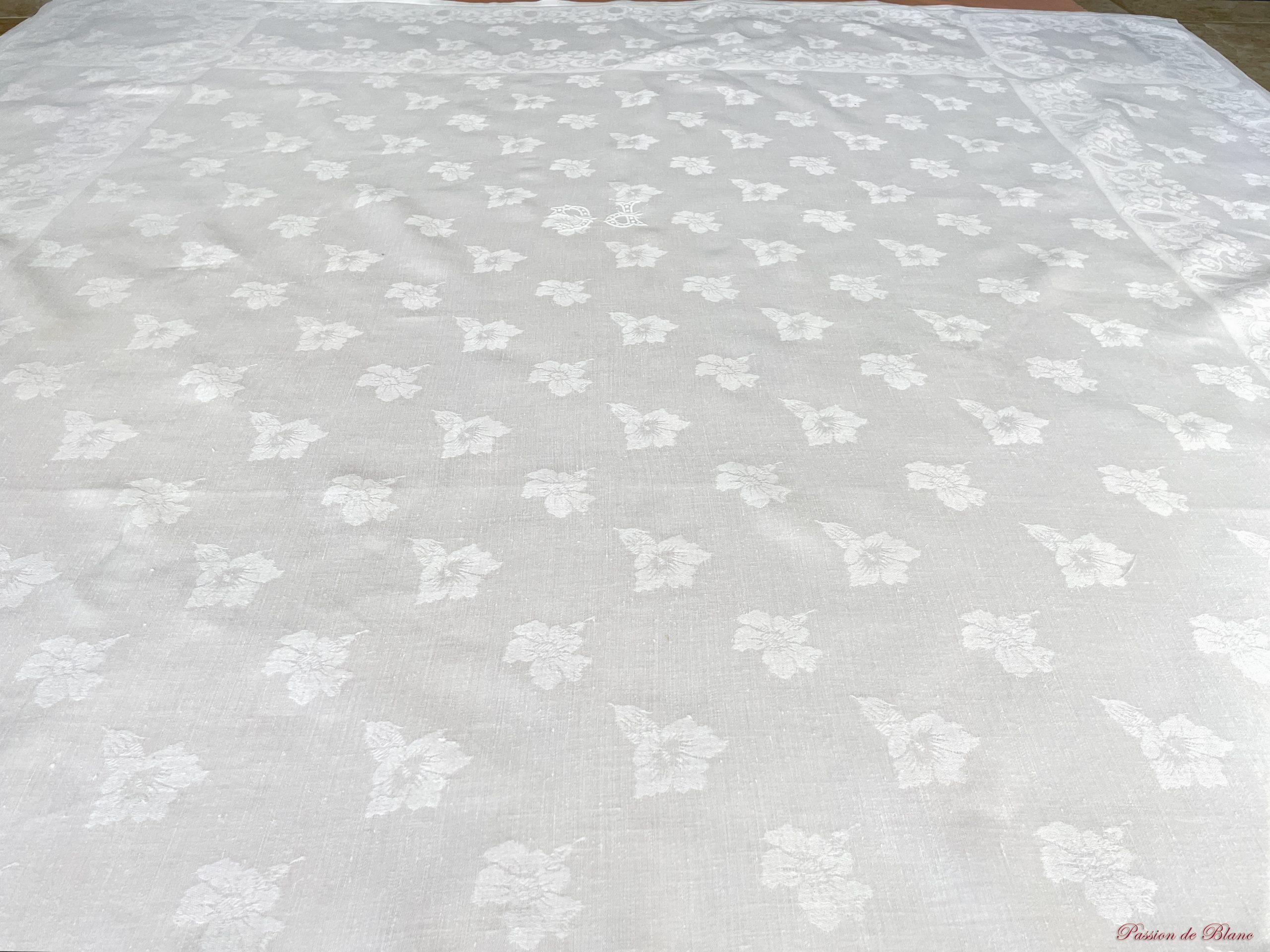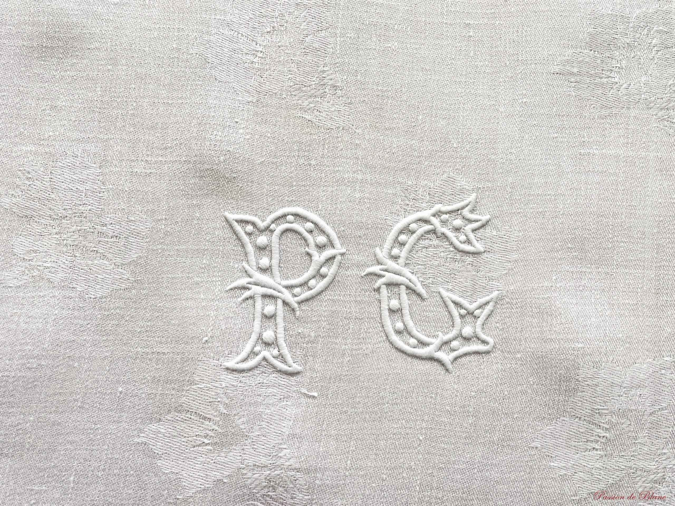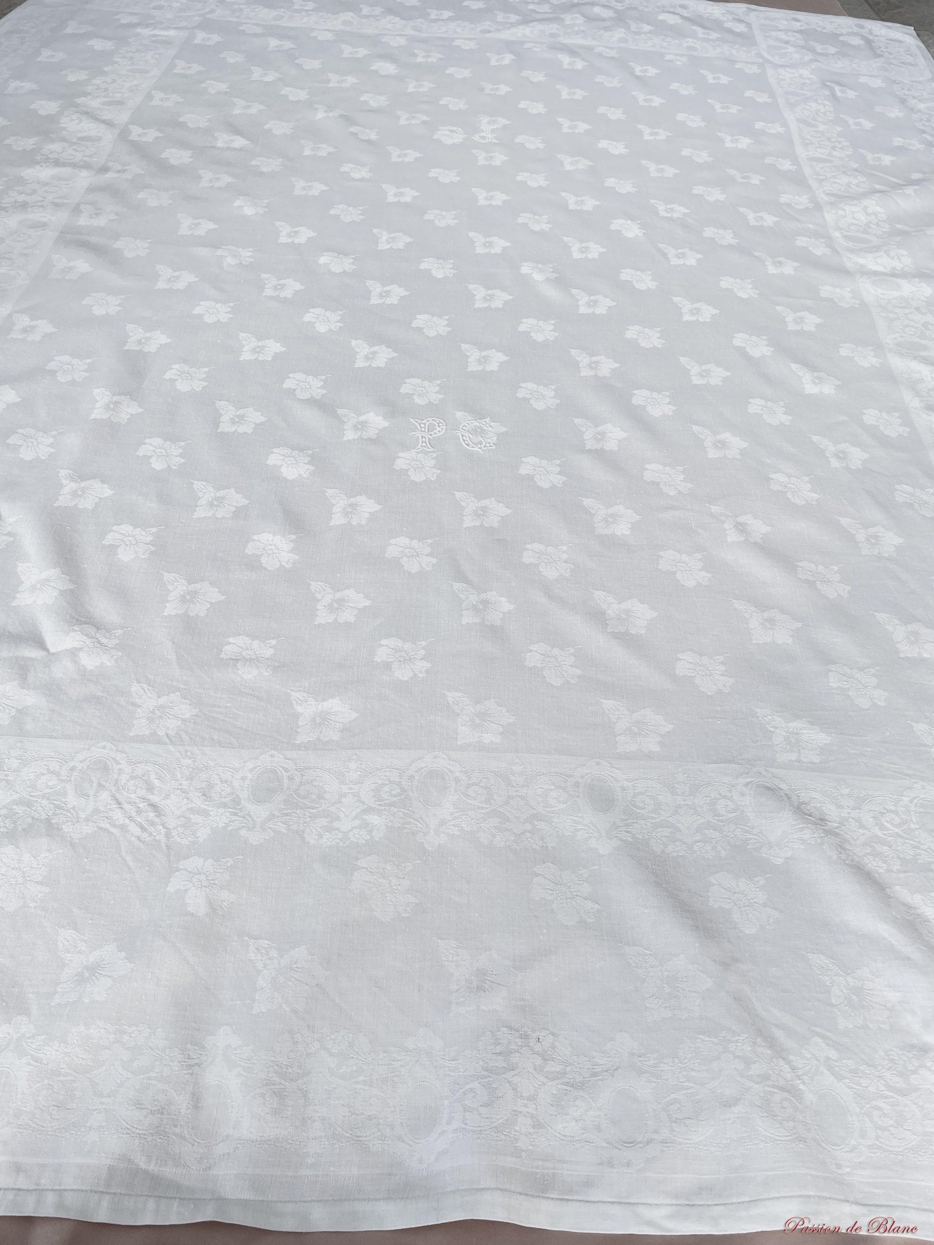 Nappe en damassé de lin fin avec 2 monogrammes PC et beaux motifs fleuris