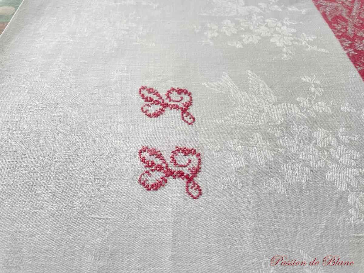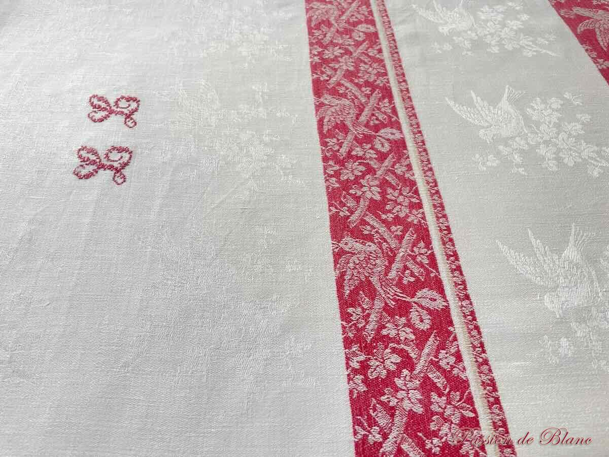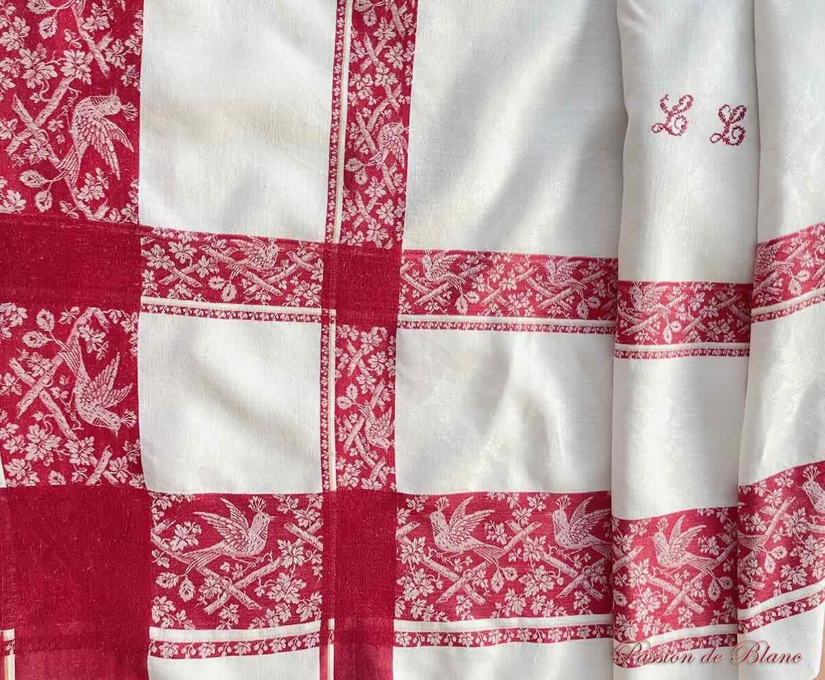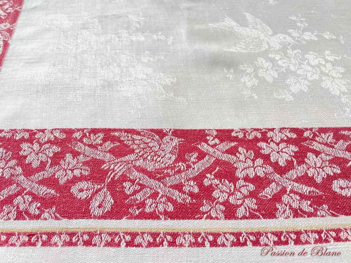 Belle nappe en damassé de lin fin avec oiseaux, liteaux rouges, Napoléon III