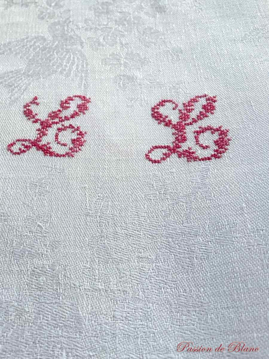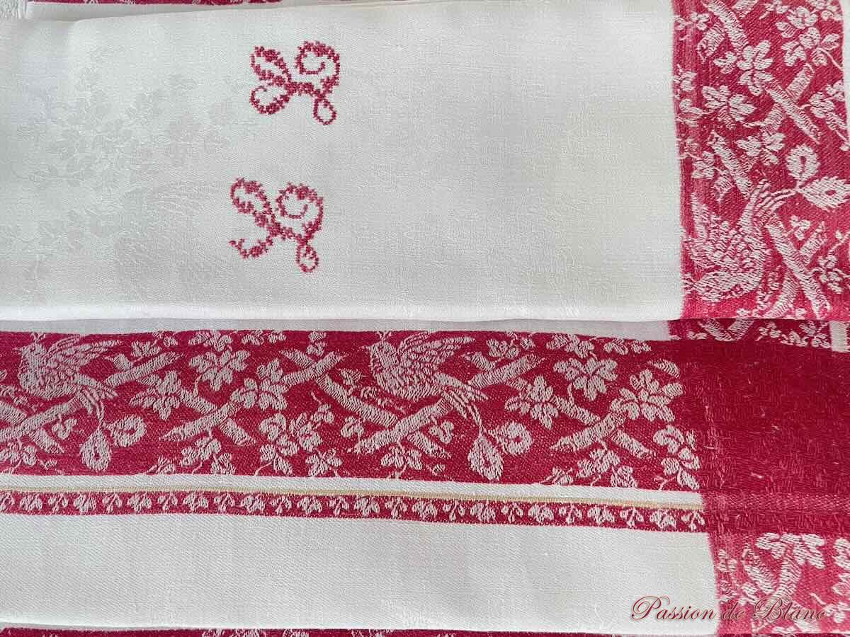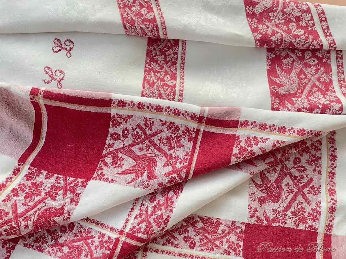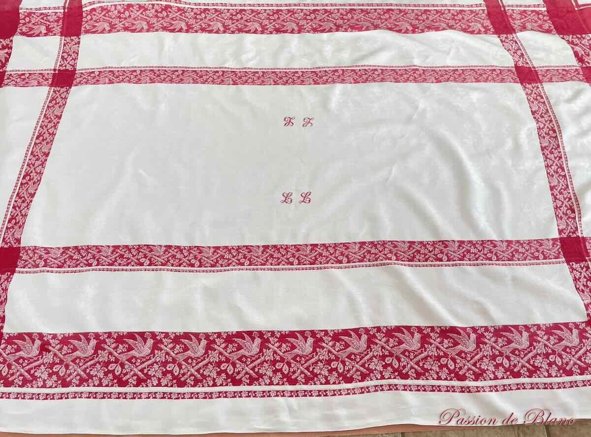 Belle nappe en damassé de lin fin avec oiseaux, liteaux rouges, Napoléon III