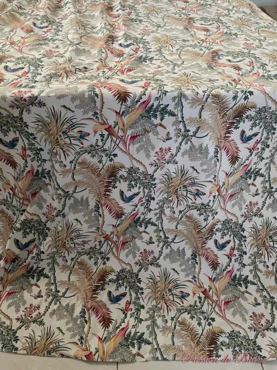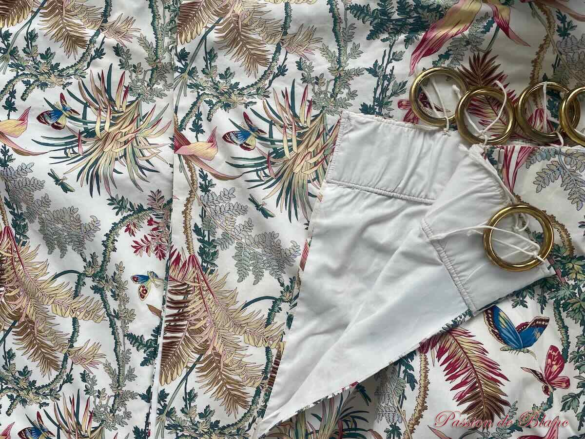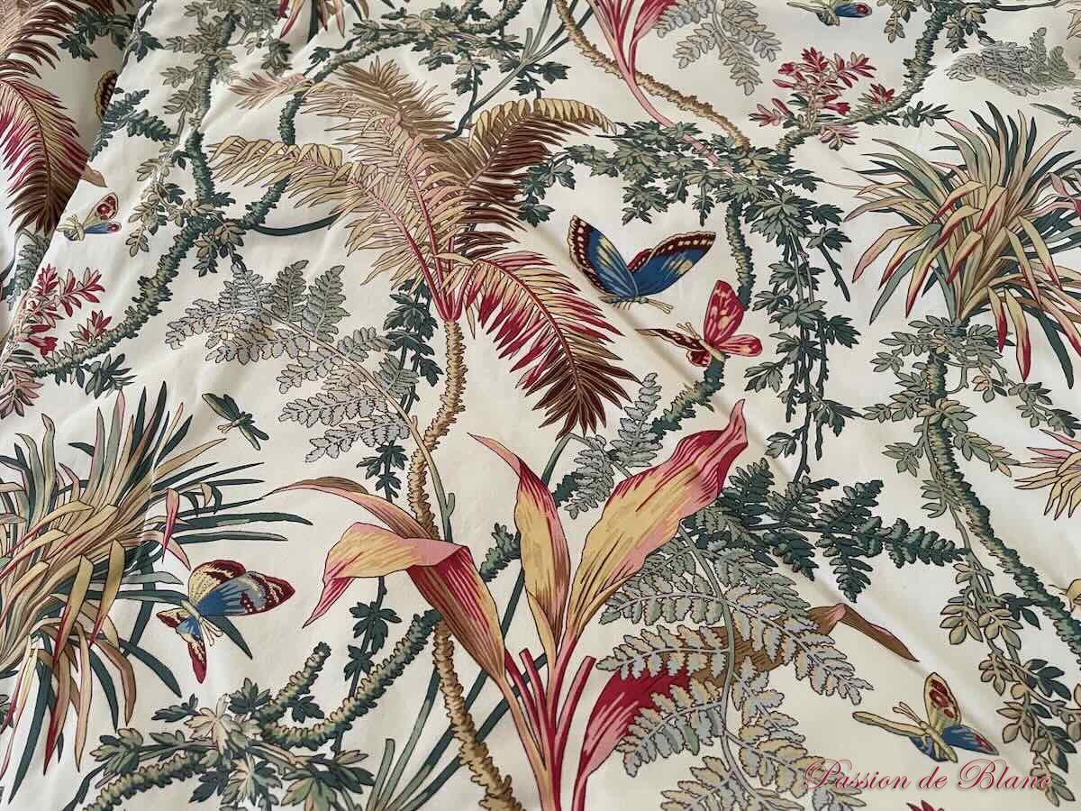 Paire de rideaux anciens en cotonnade, collection » Pierre Frey, Braquenié » des années 1990, motifs de la nature luxuriante avec des papillons sur fond blanc cassé.